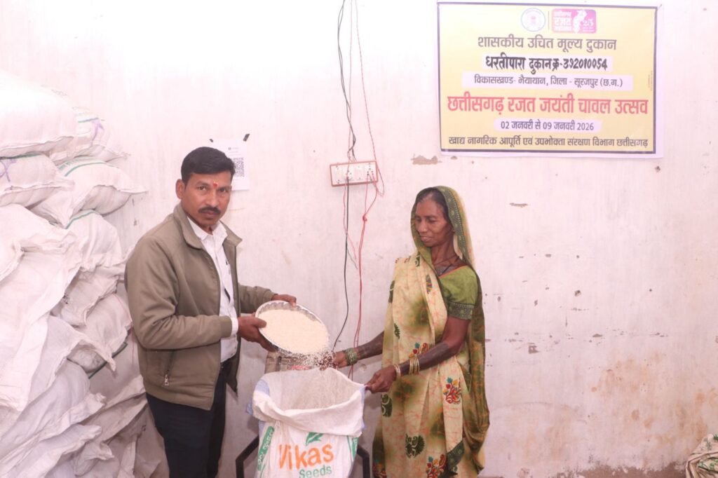 सूरजपुर/08 जनवरी 2026/   छत्तीसगढ़ राज्य गठन की 25वीं वर्षगांठ के अवसर पर सूरजपुर जिले में खाद्य, नागरिक आपूर्ति एवं उपभोक्ता संरक्षण विभाग द्वारा रजत जयंती चावल उत्सव का आयोजन 2 से 9 जनवरी 2026 तक किया जा रहा है। यह आयोजन जन-उत्सव के रूप में जिले की सभी ग्राम पंचायतों एवं नगर पालिका क्षेत्रों में जनप्रतिनिधियों की सहभागिता से संचालित हो रहा है।