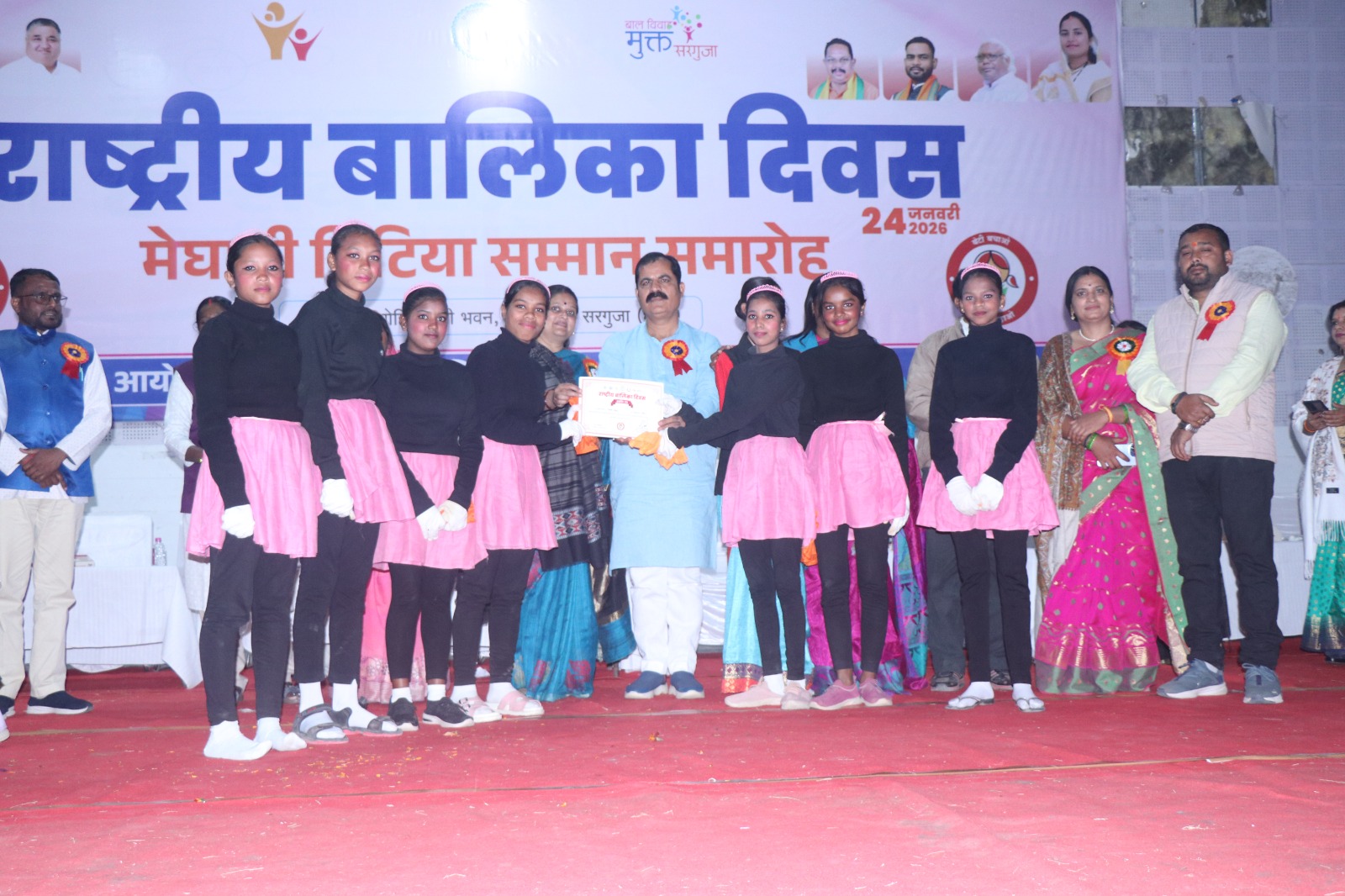 अंबिकापुर 24 जनवरी 2026/   राष्ट्रीय बालिका दिवस के अवसर पर महिला एवं बाल विकास विभाग द्वारा आज राजमोहनी भवन, अम्बिकापुर में मेधावी बेटियाँ सम्मान समारोह का आयोजन किया गया। कार्यक्रम का उद्देश्य शैक्षणिक क्षेत्र में उत्कृष्ट प्रदर्शन करने वाली बालिकाओं को सम्मानित कर उनका मनोबल बढ़ाना तथा समाज में बालिका शिक्षा और नारी सशक्तिकरण के प्रति जागरूक करने हेतु नुक्कड़ नाटक एवं सांस्कृतिक कार्यक्रम आयोजित किए गए।
