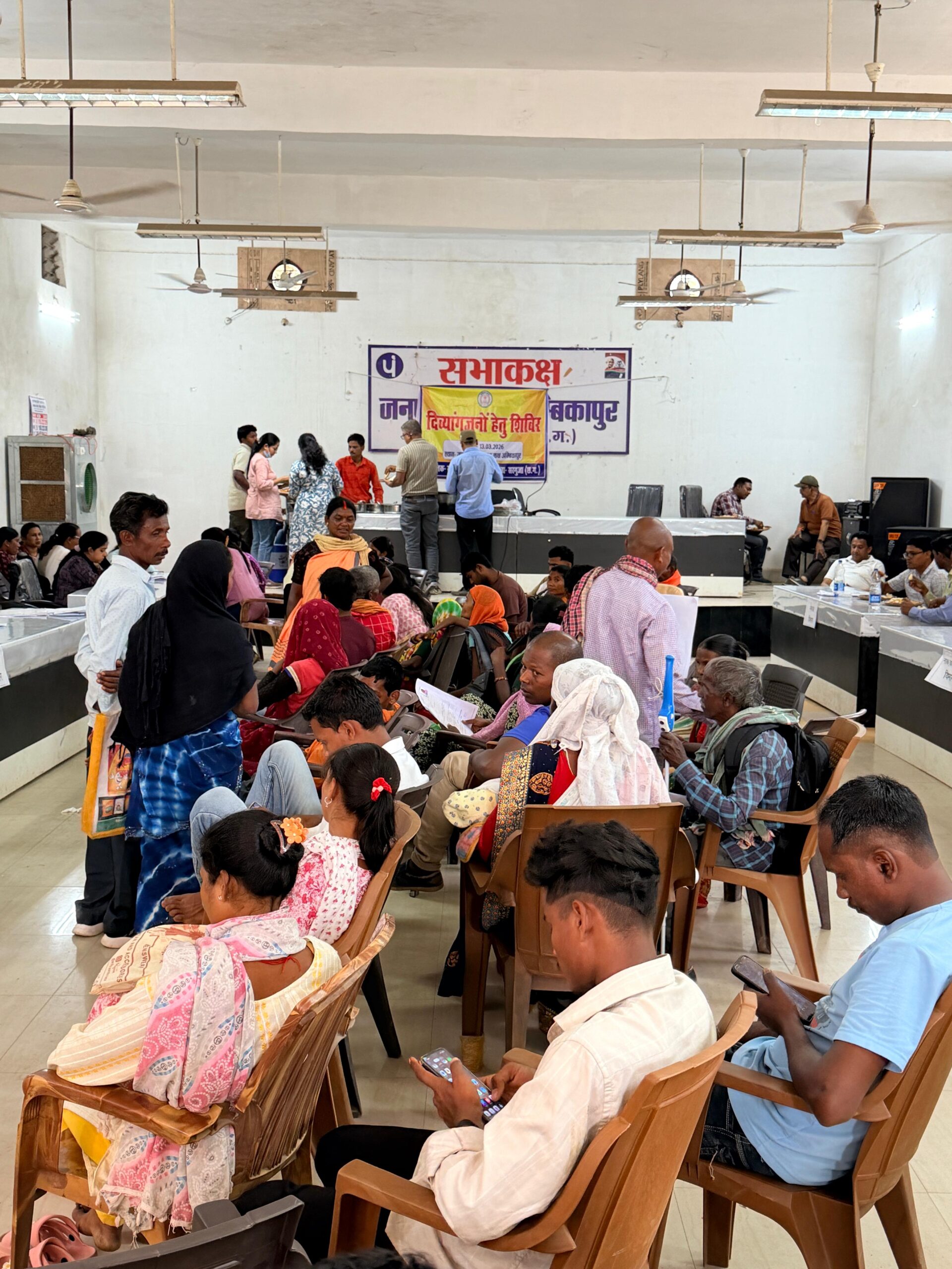 अम्बिकापुर 13 मार्च 2026/ समाज कल्याण विभाग, सरगुजा के तत्वावधान में आज जनपद पंचायत अंबिकापुर परिसर में दिव्यांगजनों के लिए विशेष सहायता एवं पंजीकरण शिविर का आयोजन किया गया। शिविर का उद्देश्य दिव्यांगजनों को शासन की विभिन्न जनकल्याणकारी योजनाओं से जोड़ना तथा उन्हें आवश्यक सहायक उपकरण उपलब्ध कराना था। शिविर के दौरान कुल 113 दिव्यांगजनों ने दिव्यांगता प्रमाण पत्र तथा यूनिक डिसएबिलिटी आईडी (यू.डी.आई.डी.) कार्ड के लिए अपना पंजीकरण कराया। इस अवसर पर विभागीय अधिकारियों द्वारा शासन की विभिन्न योजनाओं की जानकारी देते हुए पात्र हितग्राहियों को आवेदन फार्म भी उपलब्ध कराए गए। शिविर में ऐसे दिव्यांगजन जिन्हें ट्राइसाइकिल, व्हीलचेयर, श्रवण यंत्र सहित अन्य सहायक उपकरणों की आवश्यकता है, उनका स्वास्थ्य विभाग की मेडिकल टीम द्वारा परीक्षण किया गया। पात्र हितग्राहियों को नियमानुसार शीघ्र ही आवश्यक सहायक उपकरण उपलब्ध कराए जाएंगे। कार्यक्रम में समाज कल्याण विभाग सरगुजा के उप संचालक श्री वी.के. उके, जनपद पंचायत अंबिकापुर के मुख्य कार्यपालन अधिकारी श्री राजेश सेंगर सहित स्वास्थ्य विभाग की मेडिकल टीम उपस्थित रही। अधिकारियों ने शिविर में आए दिव्यांगजनों की समस्याओं को सुना और उनके त्वरित निराकरण का आश्वासन दिया।