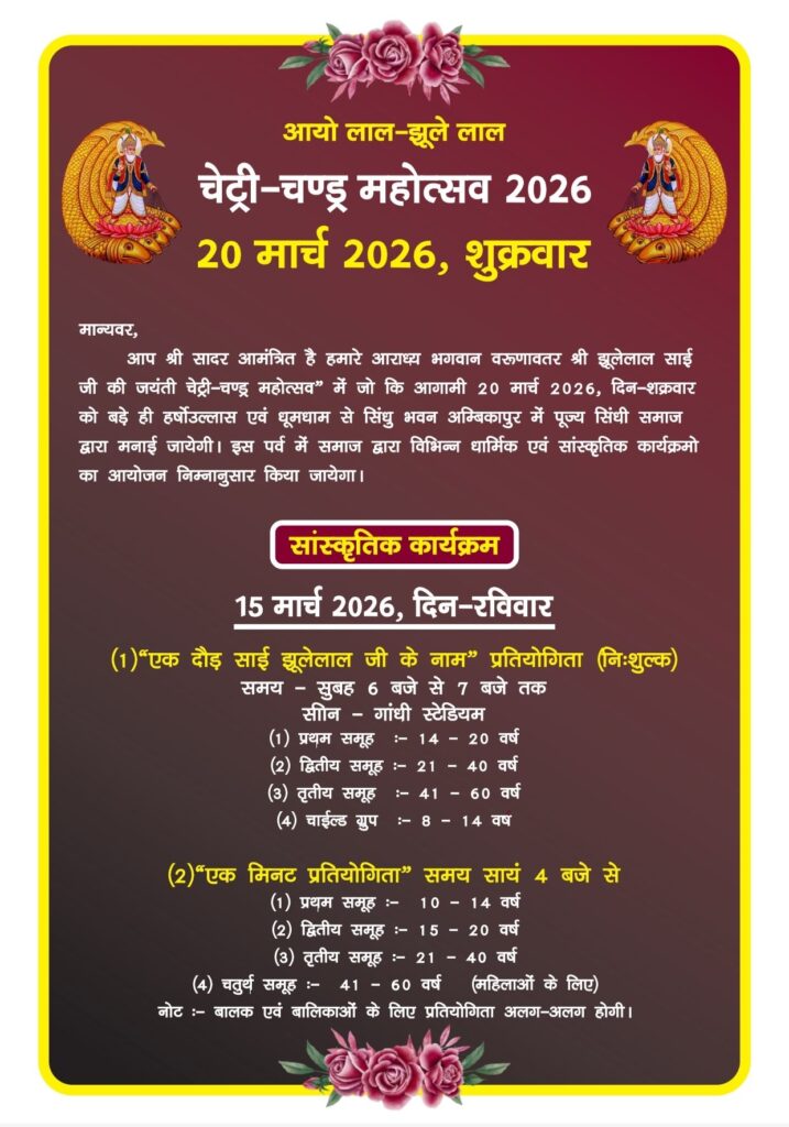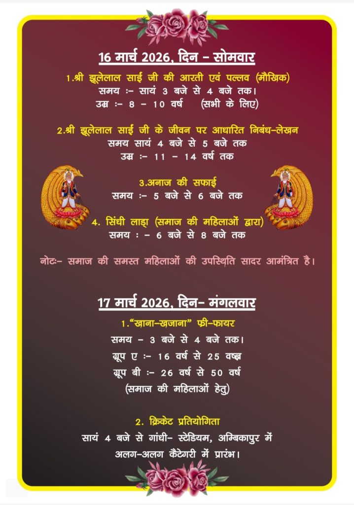 अंबिकापुर /14/03/2026/ शहर में पूज्य सिंधी समाज द्वारा हमारे आराध्य भगवान वरुणावतार भगवान झूलेलाल साईं जी की जयंती के उपलक्ष्य में “चेट्री-चण्ड्र महोत्सव” आगामी 20 मार्च 2026, शुक्रवार को बड़े ही हर्षोल्लास और धूमधाम के साथ मनाया जाएगा।