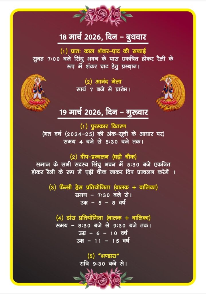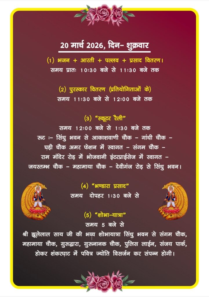 इस पावन अवसर पर सिंधी समाज द्वारा विभिन्न धार्मिक एवं सांस्कृतिक कार्यक्रमों का आयोजन किया जाएगा। कार्यक्रम के अंतर्गत धार्मिक अनुष्ठान, भव्य शोभायात्रा, भजन-कीर्तन तथा सांस्कृतिक प्रस्तुतियों के माध्यम से समाज के श्रद्धालु भगवान झूलेलाल साईं जी की आराधना करेंगे।
