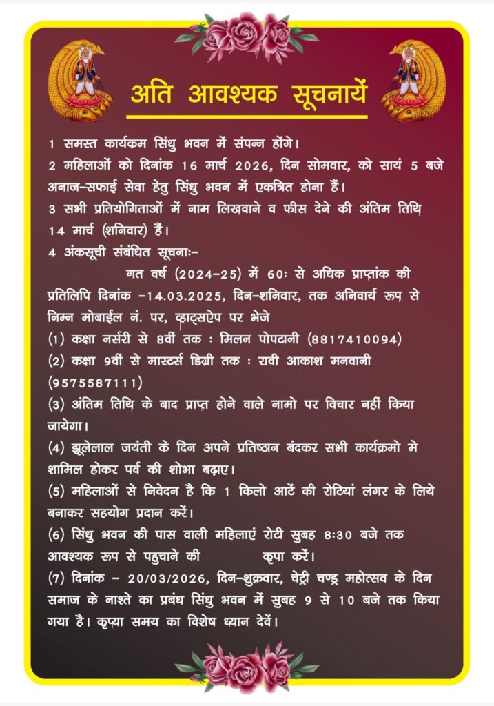 समाज के पदाधिकारियों ने बताया कि यह पर्व सिंधी समाज की आस्था, परंपरा और सांस्कृतिक एकता का प्रतीक है। इस अवसर पर बड़ी संख्या में श्रद्धालु शामिल होकर भगवान झूलेलाल साईं जी का आशीर्वाद प्राप्त करेंगे और पूरे शहर में भक्ति व उल्लास का वातावरण रहेगा।
